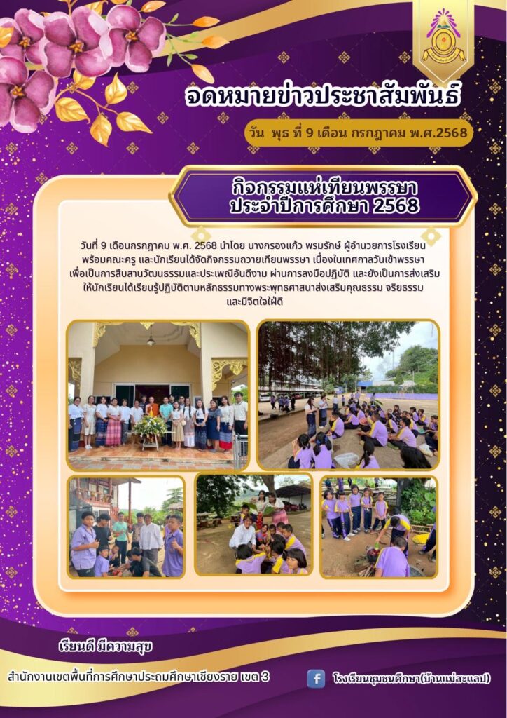 กิจกรรมถวายเทียนพรรษา เนื่องในเทศกาลวันเข้าพรรษา ประจพปีการศึกษา 2568By admin / July 7, 2025 วันที่ 9 เดือนกรกฎาคม พ.ศ. 2568 นำโดย นางกรองแก้ว พรมรักษ์ ผู้อำนวยการโรงเรียน พร้อมคณะครูและนักเรียนได้จัดกิจกรรมถวายเทียนพรรษา เนื่องในเทศกาลวันเข้าพรรษาเพื่อเป็นการสืบสานวัฒนธรรมและประเพณีอันดีงาม ผ่านการลงมือปฏิบัติ และยังเป็นการส่งเสริมให้นักเรียนได้เรียนรู้ปฏิบัติตามหลักธรรมทางพระพุทธศาสนาส่งเสริมคุณธรรม จริยธรรมและมีจิตใจใฝ่ดี