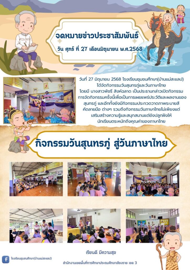 กิจกรรมวันสุนทรภู่และวันภาษาไทย ประจำปีการศึกษา 2568By admin / June 27, 2025 วันที่ 27 มิถุนายน 2568 โรงเรียนชุมชนศึกษา(บ้านแม่สะแลป)ได้จัดกิจกรรมวันสุนทรภู่และวันภาษาไทยโดยมี นางสาวพัชรี สิงห์ฉลาด เป็นประธานกล่าวเปิดกิจกรรมการจัดกิจกรรมครั้งนี้เพื่อเป็นการเผยแพร่ประวัติและผลงานของสุนทรภู่ และอีกทั้งยังมีกิจกรรมประกวดวาดภาพระบายสี คัดลายมือ ต่างๆ รวมถึงกิจกรรมวันภาษาไทยไม่เพียงแต่เสริมสร้างความรู้และสนุกสนานแต่ยังปลูกฝังให้นักเรียนตระหนักถึงคุณค่าของภาษาไทย